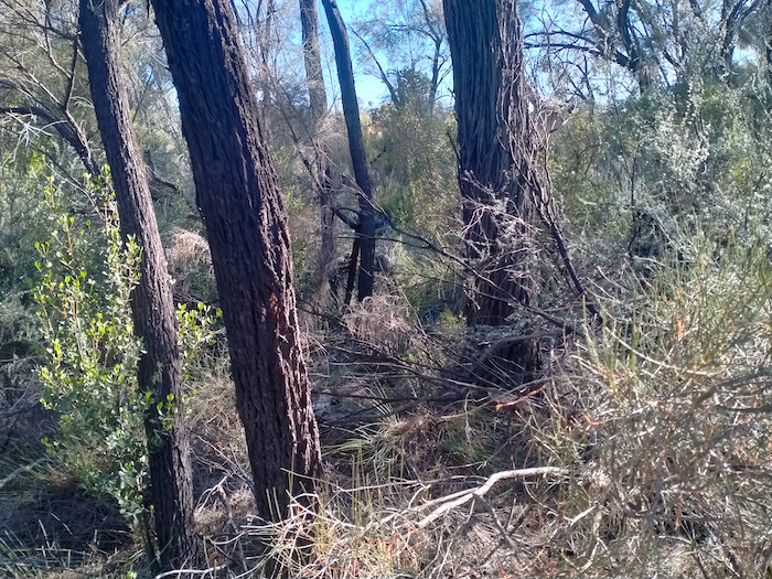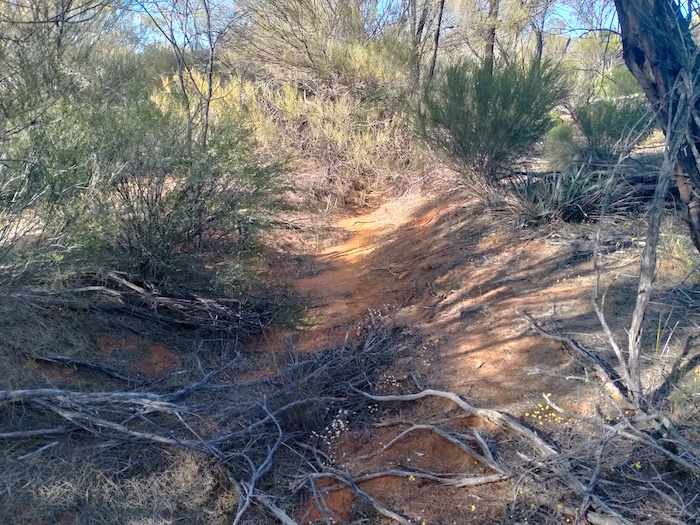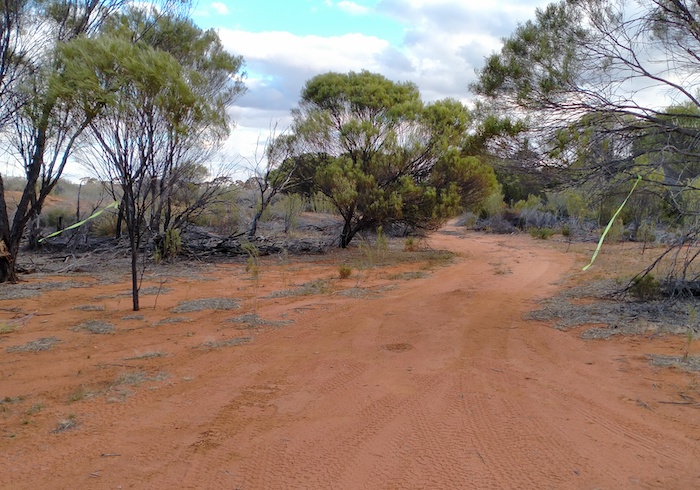 After lunch we determined to find the Hunt Track to the east of Gnarlbine. We found a way through a disused quarry to where an overgrown track was faintly visible. We followed this east for 1.3 kilometres (looking good) and then north for a further 1.5 kilometres before deciding that it was not going to take us in the direction we required. We retreated to a Y junction noticed on the outward journey and headed south-east. After two kilometres this, too, was abandoned.