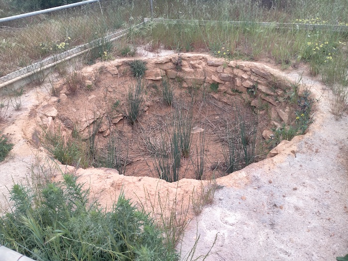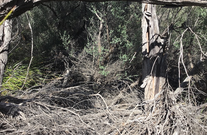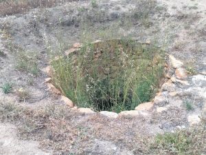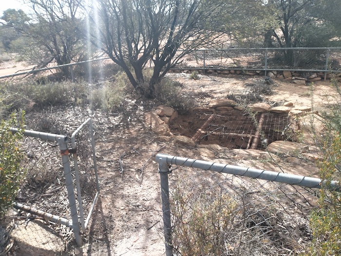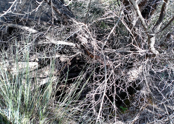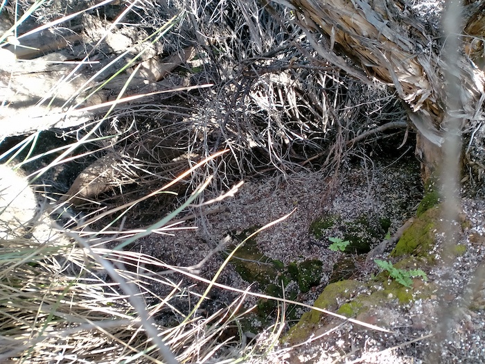 In an open area away from the rock we noticed a gully leading off the rock. Scott followed this up. Not easy. The thickets are almost impenetrable. After some time but only 20 metres he shouted that he had found a well. Time for Scott W, Kerry and me to crash through the thickets. Tough work. The thickets rip clothes and skin.