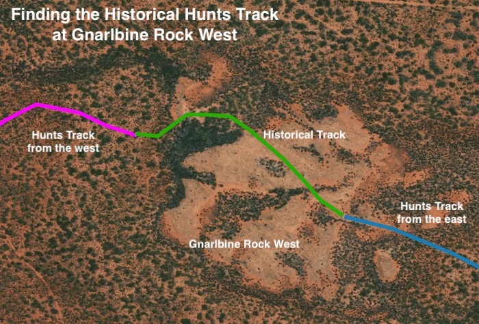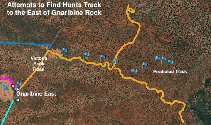Next morning we set about finding Hunt Track between Gnarline East and Gnarline West. The path from Point A to Point B depicted on the map below was not immediately clear but after plenty of effort and driving backwards and forwards from the known Track to where we thought the Track was routed we eventually were able to connect the two parts of the Track and an additional 1.4 kilometres was added to the known, usuable Hunt Track. After repositioning the directional sign a kilometre west of the rock we retired to camp for lunch.