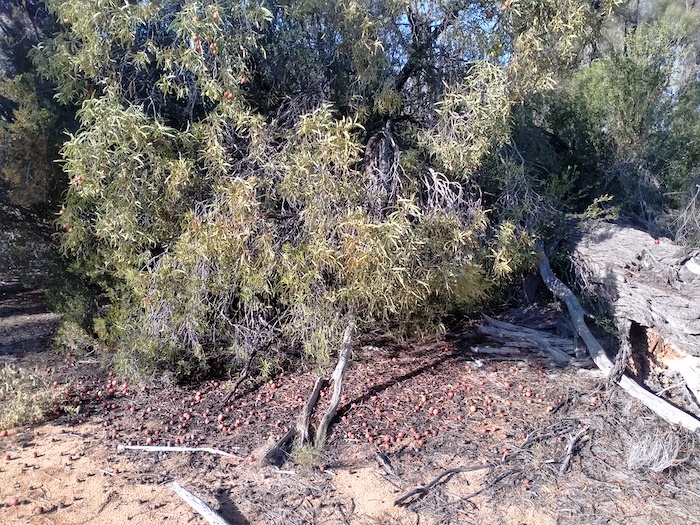 I had plotted the location of a pioneer or native well at the western edge of Gnarlbine West. It was in very solid thickets in the usual band of vegetation that surrounds granite outcrops. Granite outcrops have their own ecosystem and act as island sanctuaries for a whole range of wildlife. In the south-west of Australia they are characterised by this belt of thick vegetation around the base of the rock. In many cases, due to the large amount of runoff from the rock, this vegetation is swamp-like, even though they are located in semi-arid country.