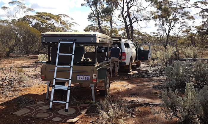 The climb up Bungalbin on the Ridge Track is easy in dry weather but could require low range if wet. While a competent driver could get a camper trailer to the small cleared area at the top it is not worth the risk, given there are suitable areas to unhitch below. The track to the south is not suitable for camper trailers.