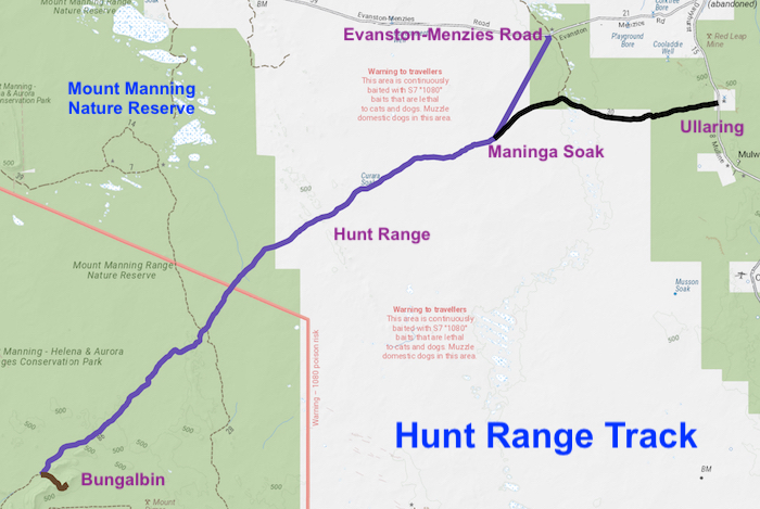From the perspective of our Road Trip the Hunt Range Track starts at Ullaring and trends south-west to its end at Bungalbin in the Helena and Aurora Range. An alternative start point for the Hunt Range Track is off the Evanston Malcolm Road at -29.85351, 120.32133. These two tracks come together at Maninga Soak, from which point it is clearly Hunt Range Track.