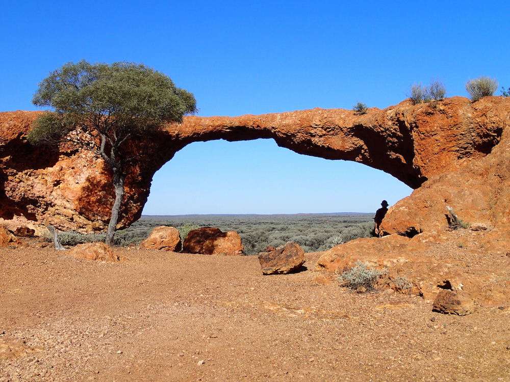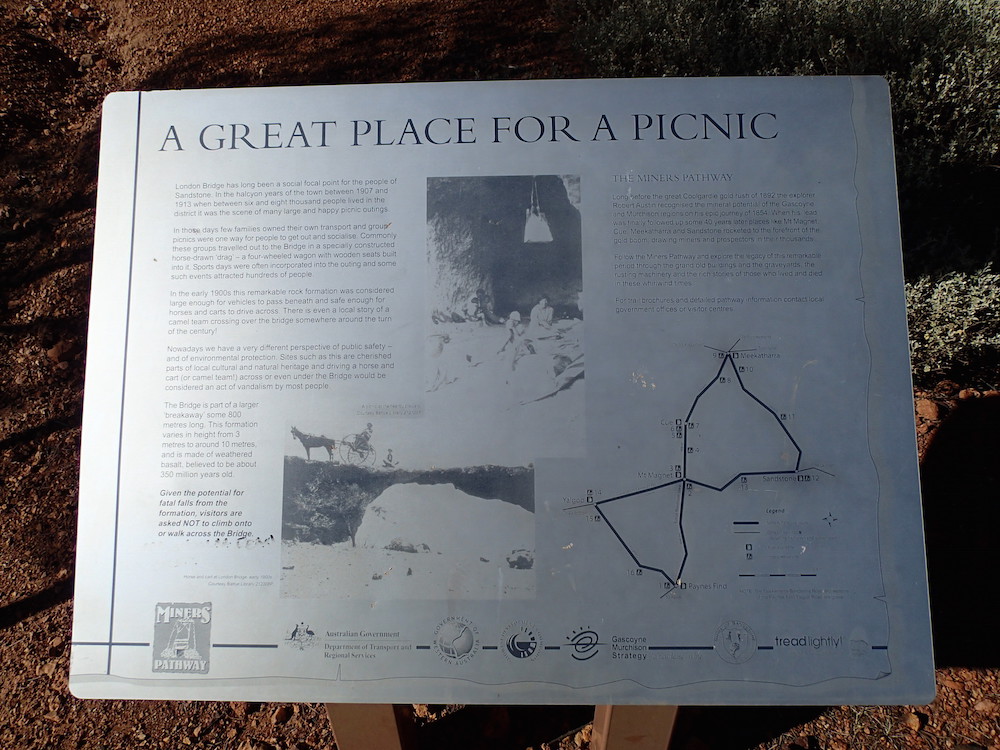 After our morning cuppa with ‘Dinky Di’ we travelled out to London Bridge, a few kilometres south-east of the town. It is a natural bridge formed of weathered basalt, believed to be about 350 million years old, and part of a larger formation about 800 metres long, varying in height from around 3 to 10 metres. The bridge is getting thinner and thinner and will eventually fall.