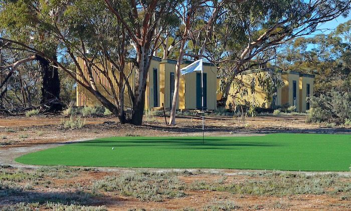 - The 15th Hole of the Nullabor Links. Note the antique mining dongas in the background. Photo Richard Carver.