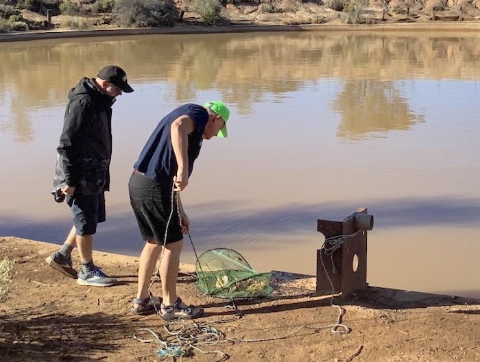 - Eric watching Kim pull in a yabble trap. Photo Tassy Epton.