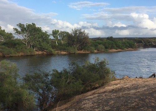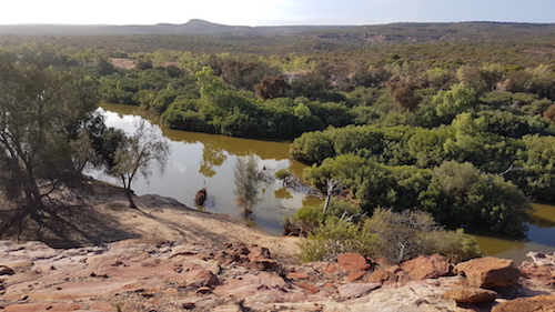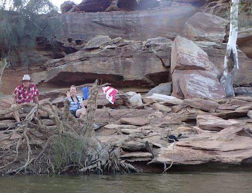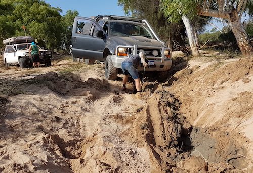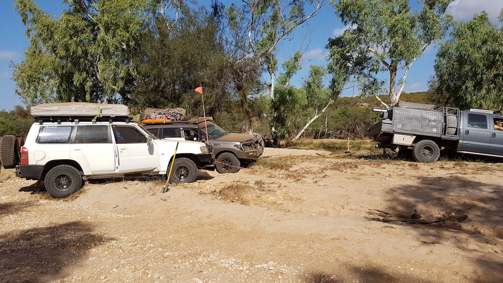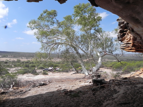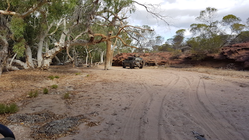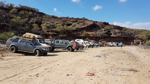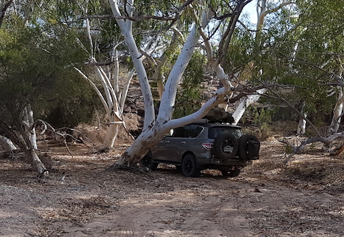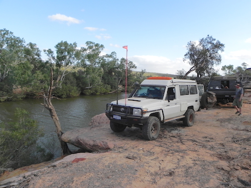 Our convoy departed the cave, turned right and headed toward the river. Once we hit the river track we decided to get closer to a pool we could see in the middle of the river bed. This part of the Murchison River is a ‘braided stream’ with numerous pools, a totally uneven stream bed and a multitude of magnificent red river gums across the full width of the river.