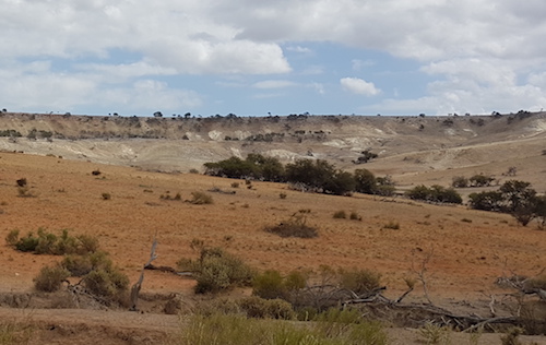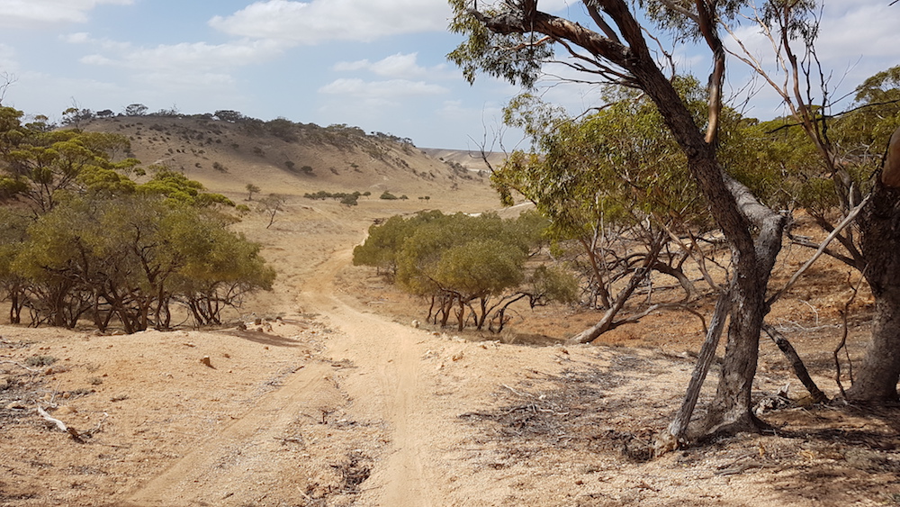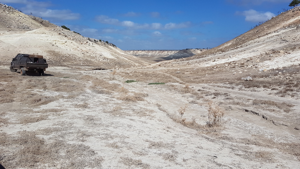 Our Route showed a turnoff to the south that would be tricky to find but the bulldozer had been through and turned it into a gentle, easy to locate sweep down into a claypan and goat trap.  The exit was also easy to spot.
