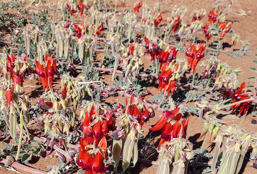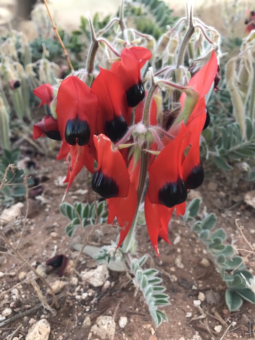 The Sturt Desert Pea is the subject of an aboriginal legend where a young girl was promised to an older man she did not want be with so she eloped with a younger man from a neighbouring tribe. The old man attacked and destroyed the younger man’s tribe and when he later returned to gloat over the bleached bones of his victims he found only carpets of brilliant flowers with ebony eyes that had grown from the blood of the people he had killed. Every season the flowers of blood spread their brilliance over the arid plains of the outback as the Sturt Desert Pea.