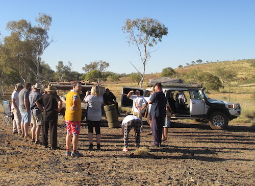 - Morning briefing at Skull Springs before the road trip continues.