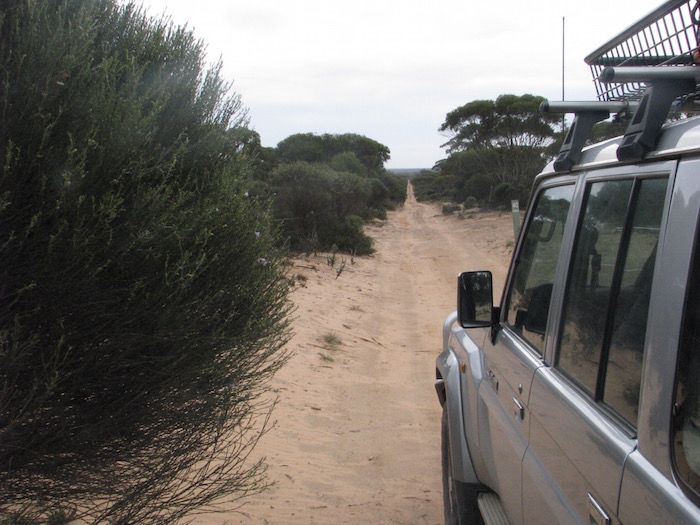Forty kilometres further east the convoy turned off Eyre Highway north into Nuytsland Nature Reserve to find an alternative way to Cocklebiddy Cave. The first deviation was a sinecure – the track turned 90 degrees to the east. With a a fence in front of me there was no option.
