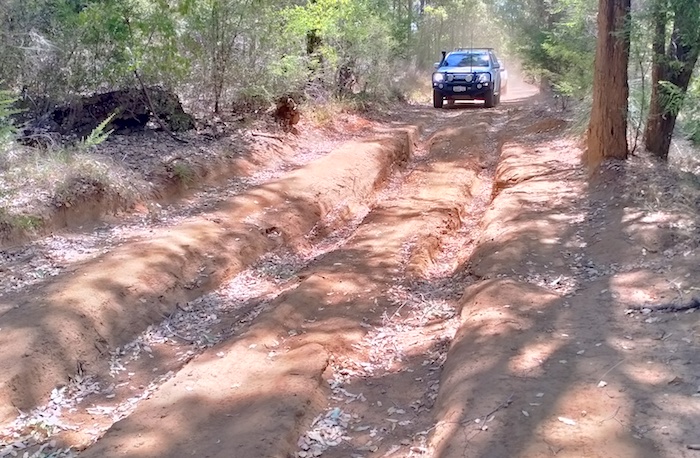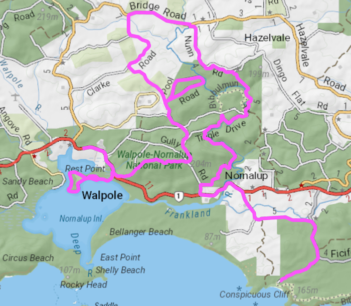 On Saturday we left Jarrahwood, refuelled at Bridgetown and headed out on Seaton Ross Road that would take us south to Shannon. Track closures in Greater Kingston National Park stymied my plan to turn south on Edwards Road, then Whim Landing Road, then Warrup Road, and then Telephone Track. We arrived at Corbalup Road and finally were able to turn south. Thirteen kilometres further on and we were back on our planned route.