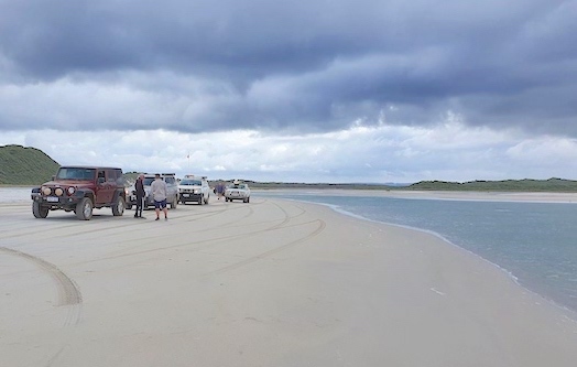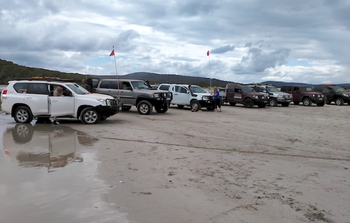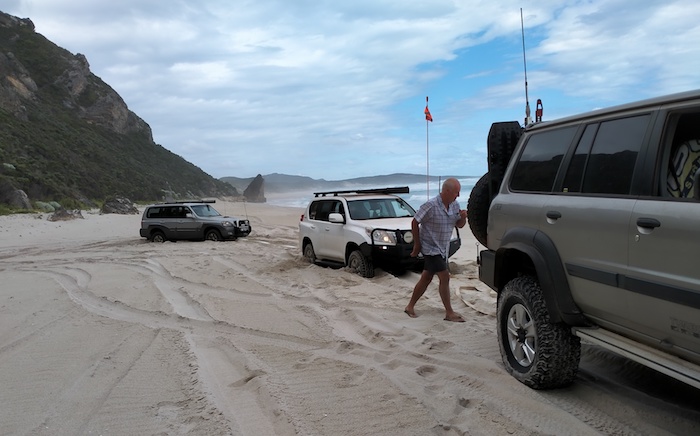 We then drove to the eastern end of Bellanger Beach. John got bogged and Graham went to retrieve him which ended up with both of them being bogged.  Scott retrieved both together. 300 h.p. at the wheels helps.