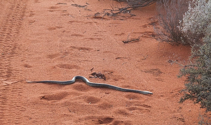 The track was tight and overgrown for many kilometres – mulga and other acacias. Not long after we passed through a gateway to head north-east Mushy had an altercation with a King Brown snake. It reared up at his vehicle before slithering off the track into the scrub.