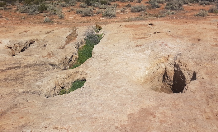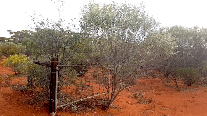 At Gnarlbine we searched for a known, second well, 200 metres SSE of the main well. The scrub is extremely thick in this area and previous searches had been unsuccessful. After I described the general area where I expected the well to be, it was found within minutes. The well is accessible from a gravel ‘carpark’ just south of the Rock. A path leads to the well at 31°9’18″S 120°57’32.26″E. [A photograph of the access track taken after this Trip is here].