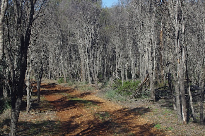 Eleven kilometres further on ‘the Coujinup Track’ diverted to the south-east and we continued on the singularly-titled Dunn Track to the north-east. The country had recently been ravaged by bushfire and was looking decidedly sad.