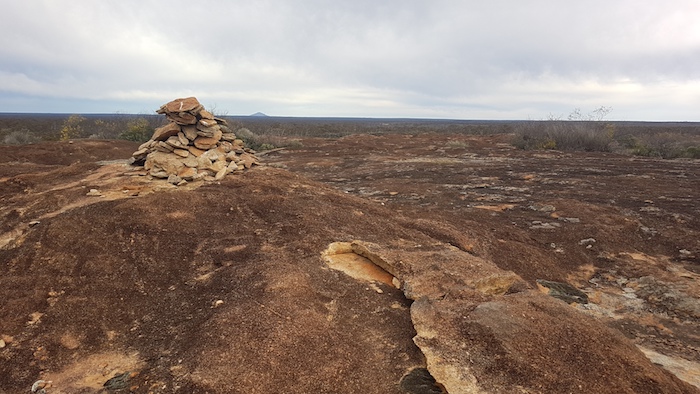 - Cairn at the top of Moir Rock with Peak Charles in the background.
