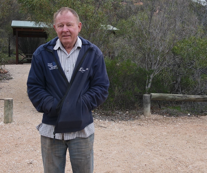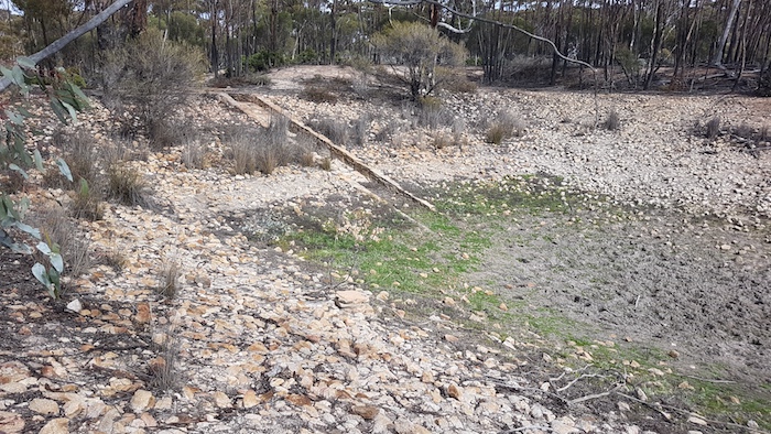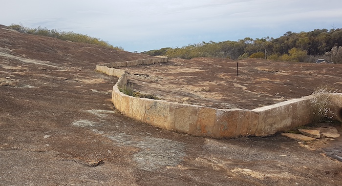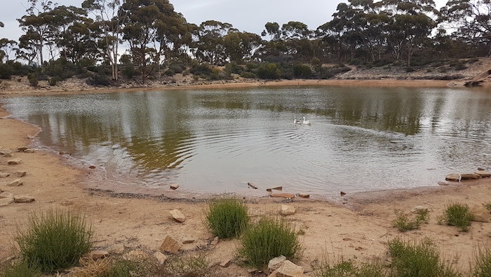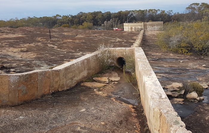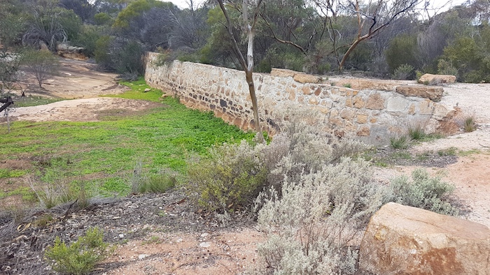Although long since abandoned and falling into disrepair, the amount of work that went into the construction of the dam emphasises the importance of water supplies in this dry environment – before the precious liquid was piped from the coast. A few kilometres further on, at McPherson Rock, the dam has been maintained. An outbreak of Noogoorah Burr next to the dam was quarantined.