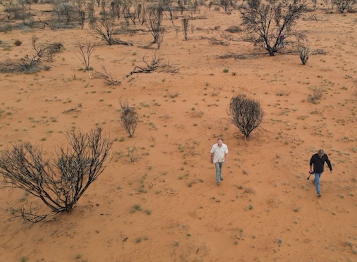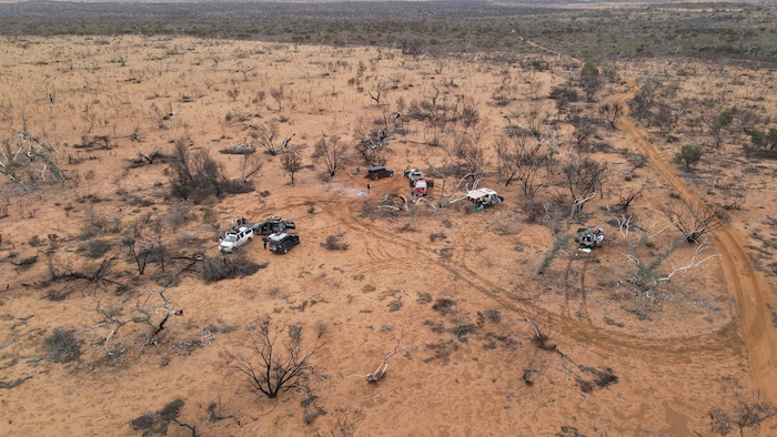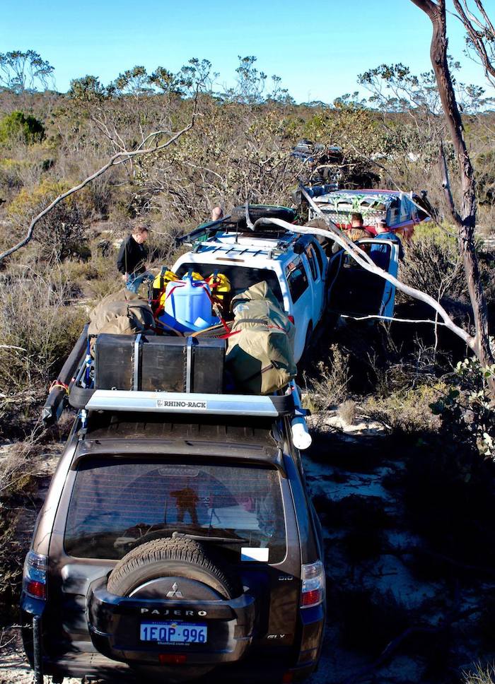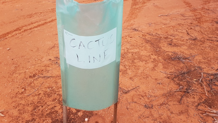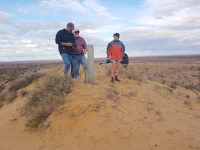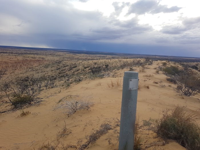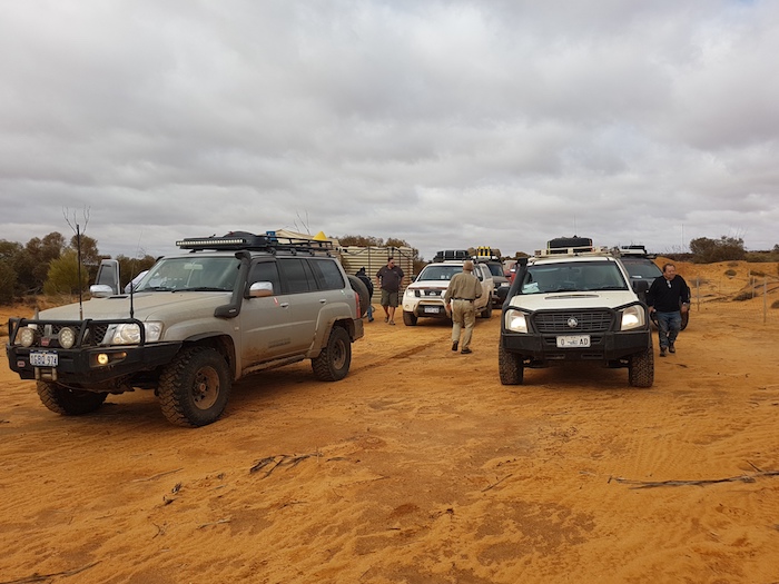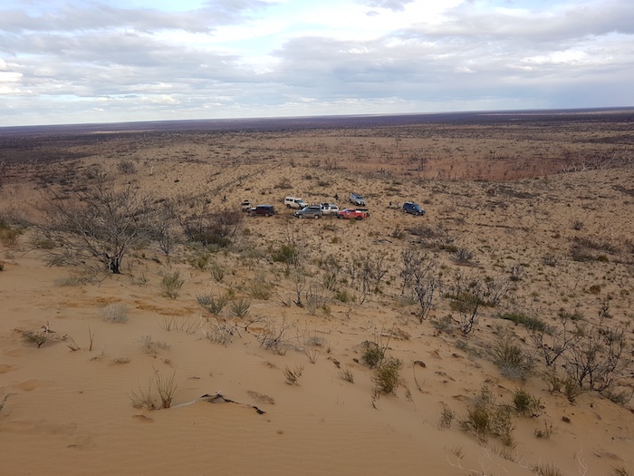 At the Tropicana Highway we had to again pick up the PNC Baseline. The roadworks did not make this easy. Mushy put up his drone and soon located a track. It appeared that a vehicle or two had been along the track reasonably recently (possibly early August from the info left in the visitors’ book at Queen Victoria Spring), however, not many other vehicles had been on the track for many years. It was very overgrown and damaged the fittings on our vehicles. It was to be 25 kilometres before it opened out.