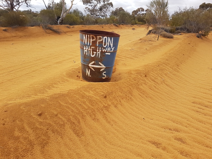 Our camp was less than 100 metres from a break in the dunes – the reason the track was routed where it was. As the track wound its way north this method was used more and more. There were deviations of up to two kilometres to get around the end of dunes running east-west. The track would then be routed in the swale until the next break was found. About 32 kilometres after leaving camp we arrived at Argus Corner and turned right onto the Nippon Highway.