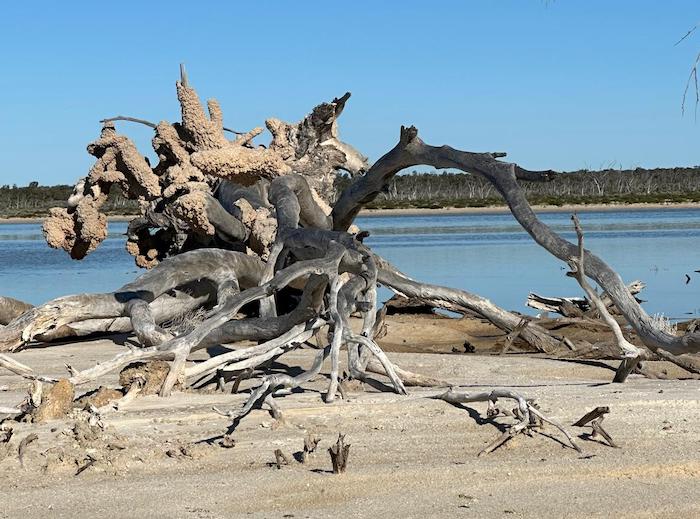 The lake bed was fascinating. Encrustations on long submerged trees and plants now exposed to the elements were amazing. Ducks and small birds were common. There were small fish in the water.