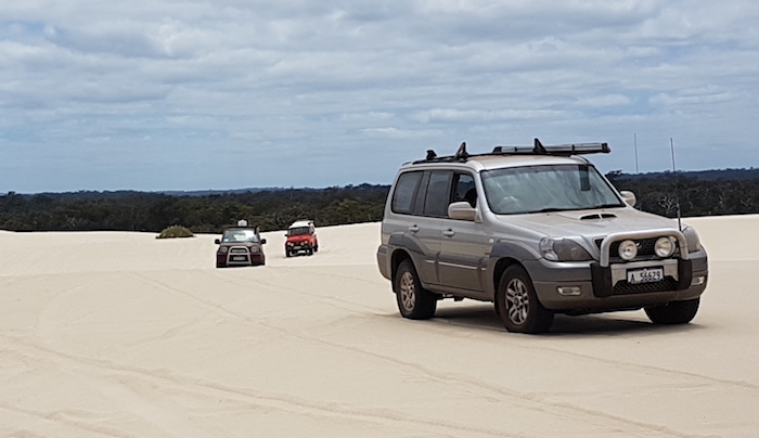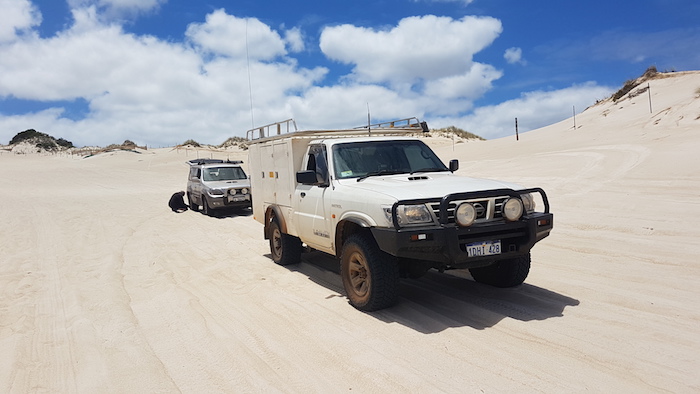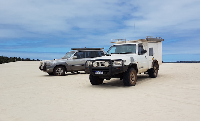 - John’s Tucson and Kim’s Patrol on top of Yeagarup Dunes just after climbing the sand access ramp.