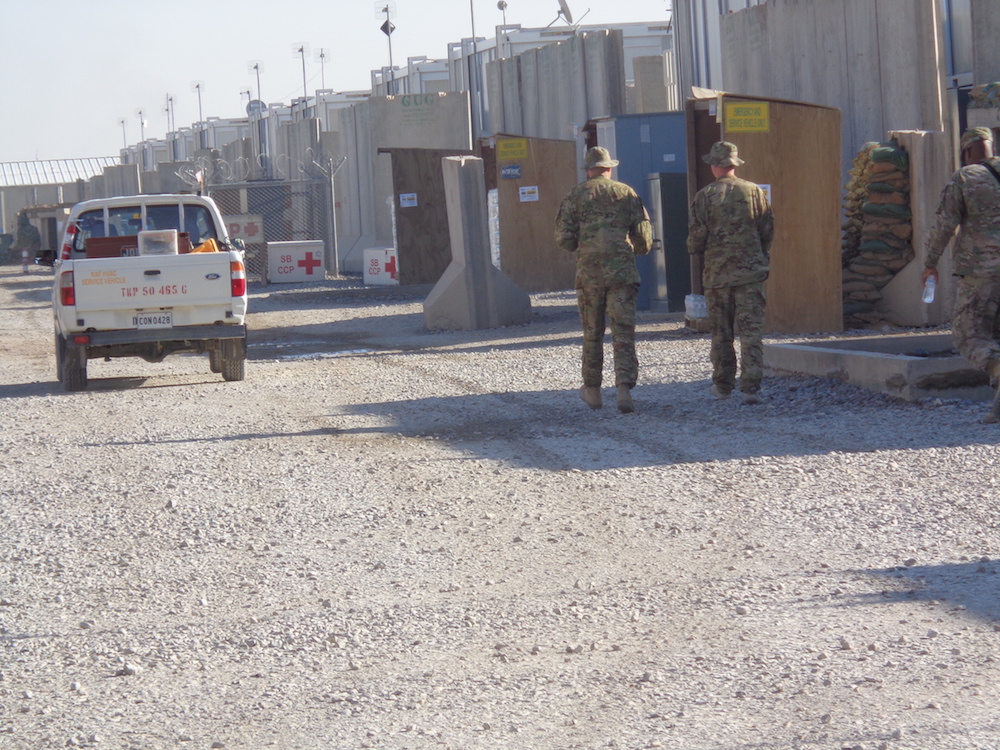 When one walks out of a DFAC, office or other building there is always a protective concrete wall. It is not possible to walk directly out of any structure. This is a safety/security feature. Green on blue attacks were a regular occurrence while we were there. Unless they involved Australian personnel they went unreported in the Australian media. Five Slovaks had been killed in the week before we arrived.