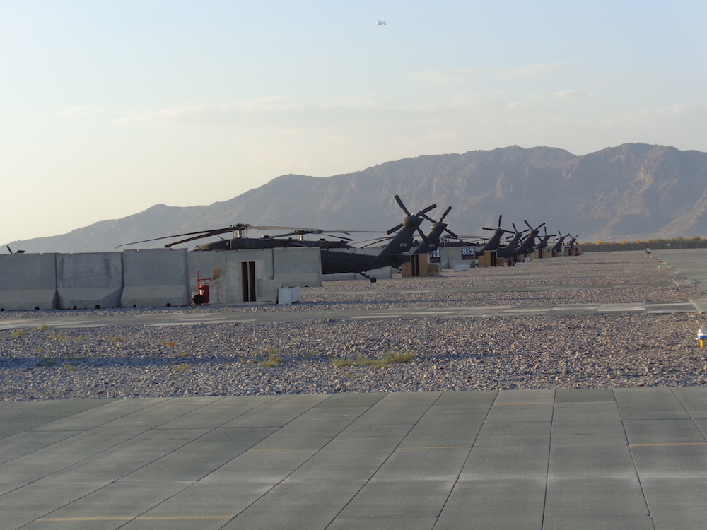 KAF is alive with activity from every imaginable flying apparatus. Fast jets scream overhead, dual-rotor Chinooks lift off in a cloud of dust, unmanned Predators and Reapers take off and land at the far end of the runway, C130s taxi in to deliver another contingent of troops and pick up those departing, Galaxy C5s lumber out occasionally, ancient Russian-designed helicopters are parked in the distance, and Blackhawks are lined up waiting for action.