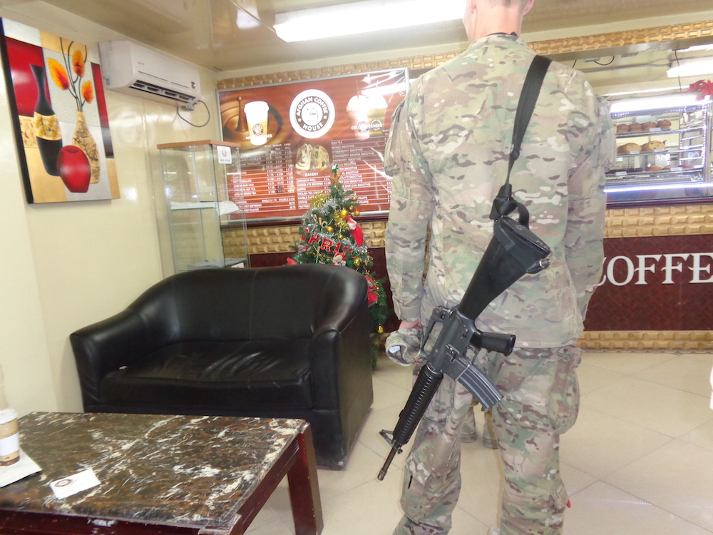 - Soldier with an M16 in one of many coffee shops.