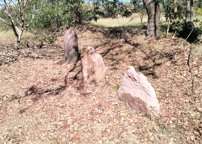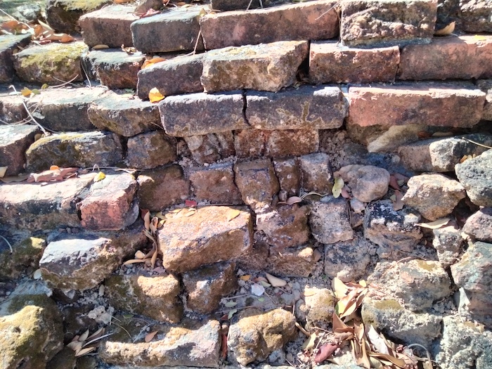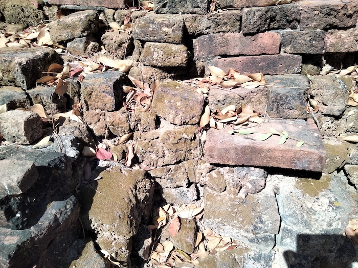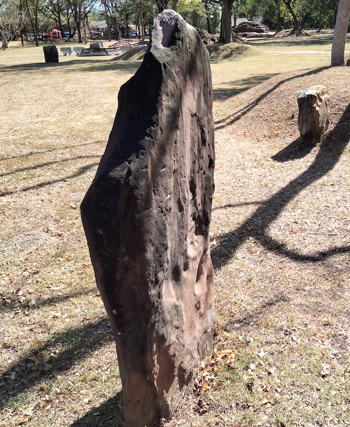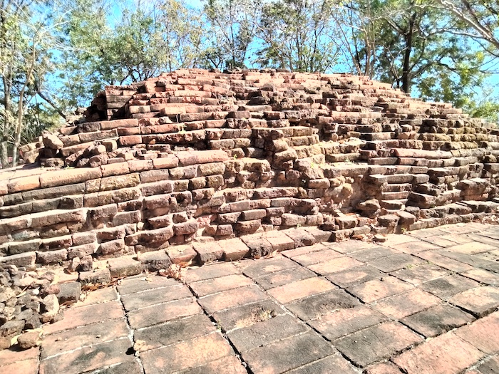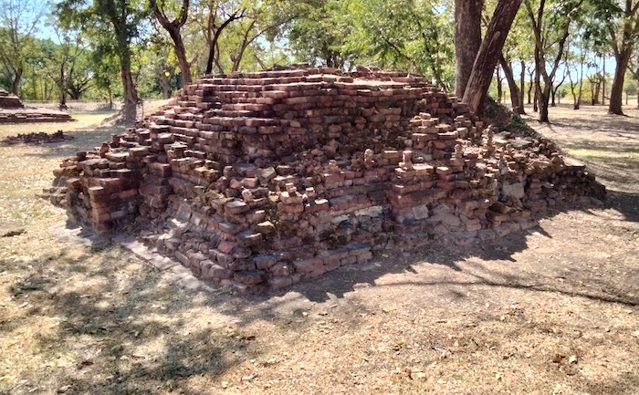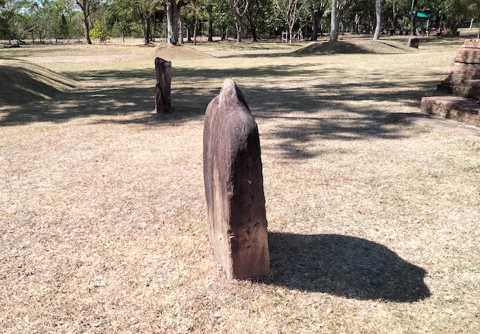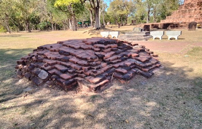 The remains of five square brick structures (bases only) in various states of repair are still visible in a north-south direction south of the chedi. Boundary or perimeter stones, known as semas, are positioned around the chedi.