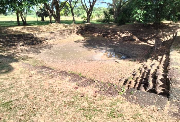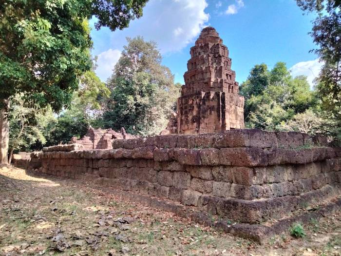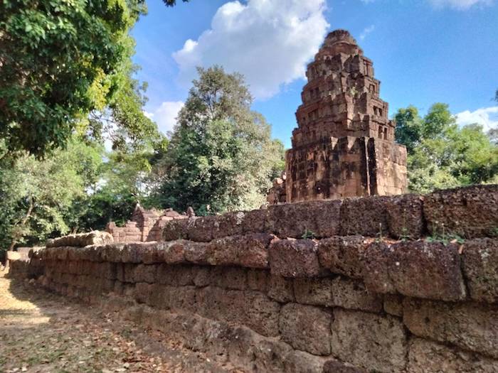Prasat Ta Muen Solitary prang on a substantial base. Baray at Prasat Ta Muen. Laterite stone base of the remaining prang.