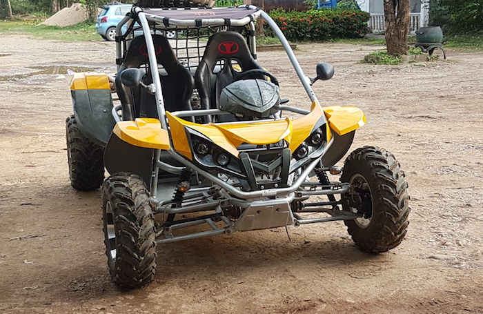 - One of the many buggies for hire in Vang Vieng. The lack of a licence plate doesn’t stop thrill seekers from driving them around the streets and back roads of Vang Vieng.