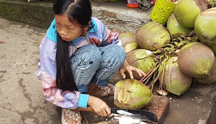 - Preparing coconuts for sale at a restaurant at the Kuang Si parking area.