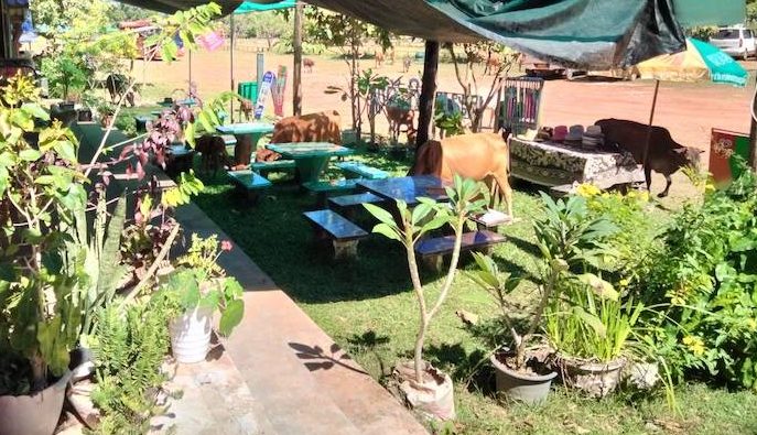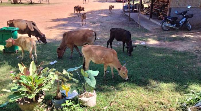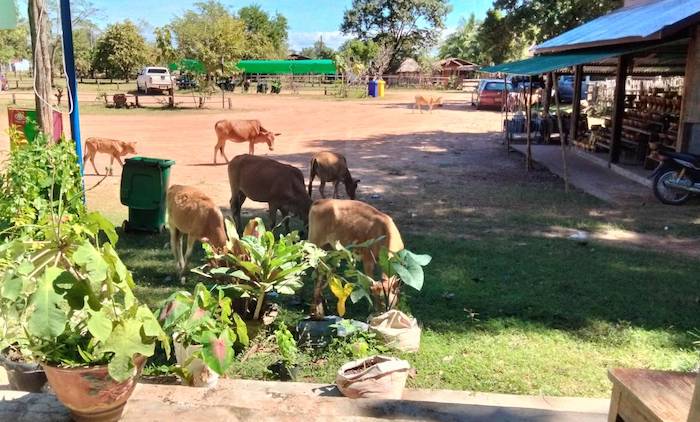 The lunchtime setting at Wat Phou had a definite rural flavour. Cows wandered among the tables. No one cared.