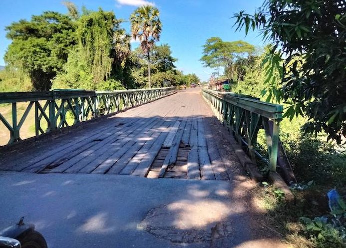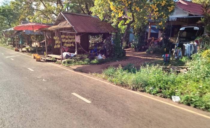 We crossed the Mekong River and turned south towards our destination. Within a short distance we were stopped by road pirates disguised as Police. After paying a ฿100 fine for being tourists we were allowed to continue. No receipt.
