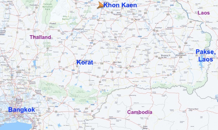 The journey from Khon Kaen to Chong Mek at the Thai/Laos border is about 380 kilometres and will take 5½ to 6 hours depending on stops. Negotiating all the traffic lights along the Roi Et bypass is excruciating.