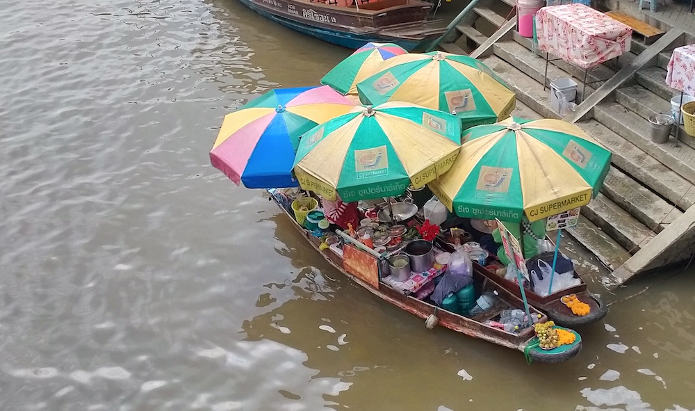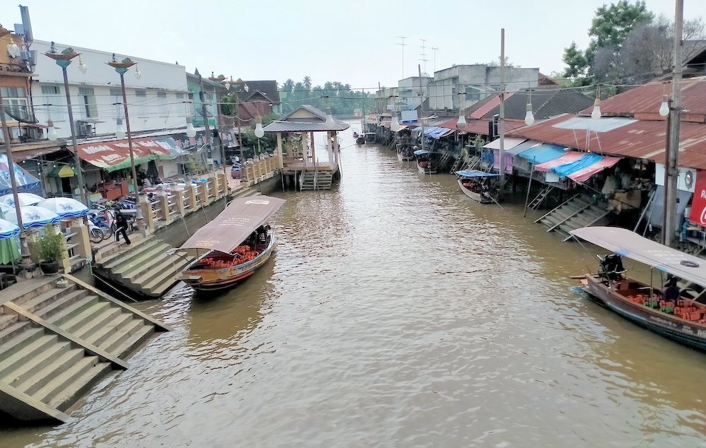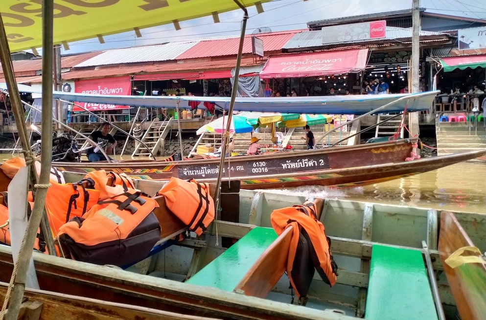 The Floating Market is 90 kilometres south west of Bangkok and takes about an hour and 45 minutes by road although that travel time should be reduced considerably once the massive roadworks covering many kilometres are completed.