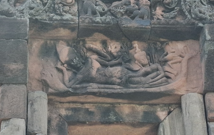 - Prasat Pueai Noi has a two well-preserved lintels. This one features an engraved Narayana laying on the Naga. It is believed to be 800 years old.