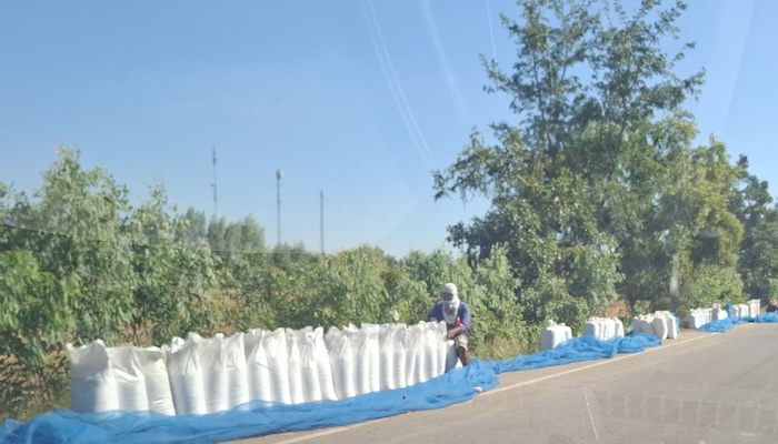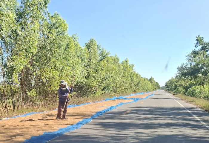- Rice is spread to dry on public roads.