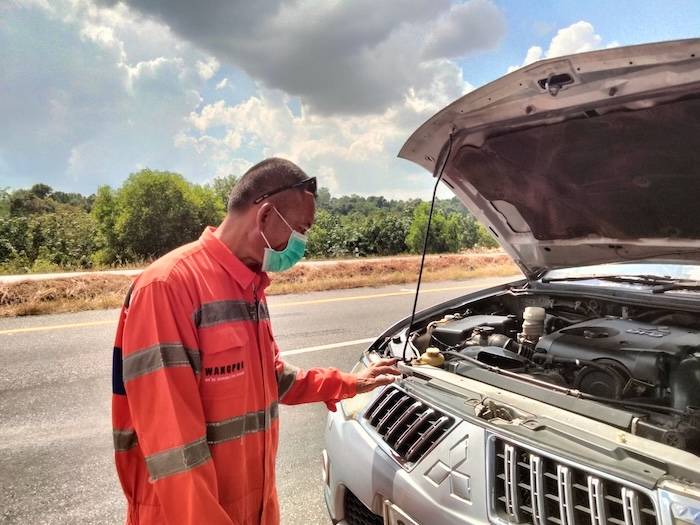 I diagnosed loss of water and a severely overheated engine. I think the engine is cactus. The need to top up the radiator was a known issue – the brother in law was topping it up every day. It was full when we departed and ran well for 120 kilometres. Then something catastrophic happened. The irony of the situation is that we were going to this mechanic this afternoon for him to check the aircon.