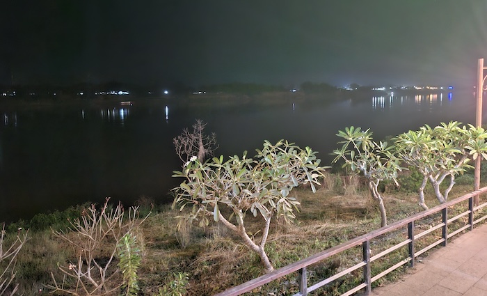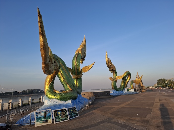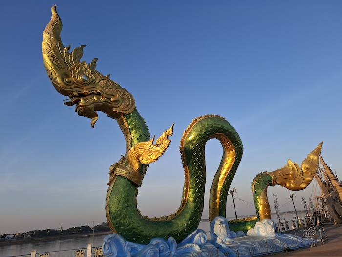 The promenade on the river bank close to the Friendship Bridge is popular with visitors, merchandisers and street food vendors, and is the site of some spectacularly-decorative Nagas.