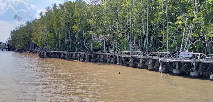 - A boardwalk winds through the mangroves.
