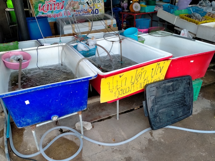 The market in Chao Lao has produce and general items on one side of the road and seafood on the other.