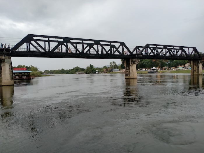 The pictured bridge is conveniently located near the centre of town, restaurants are positioned immediately downriver from it and a train crosses it regularly, all making it convenient to tell tourists that it is the famous ‘Bridge over the River Kwai’. However the bridge built by PoWs during WWII is further upriver.