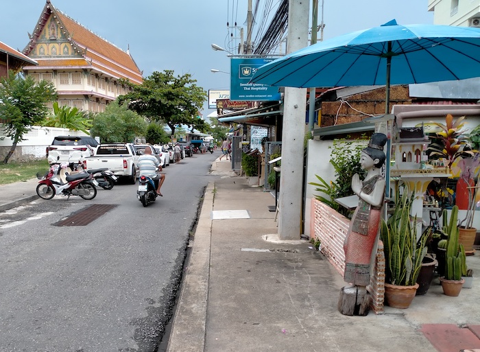 In Chumphon walking street and the main road are one and the same. Street food vendors blocked the footpath forcing pedestrians to tangle with the traffic. Patrons sat a small tables on the footpath – further obstacles to walkers. And those walkers needed to be cautious to step over electric cables running through puddles of water on the footpath on their way to powering lights for the street vendors’ cooking carts. Nothing too daunting to an experienced tourist in Thailand, As ever, the biggest challenge a visitor faces is the uneven footpath.
